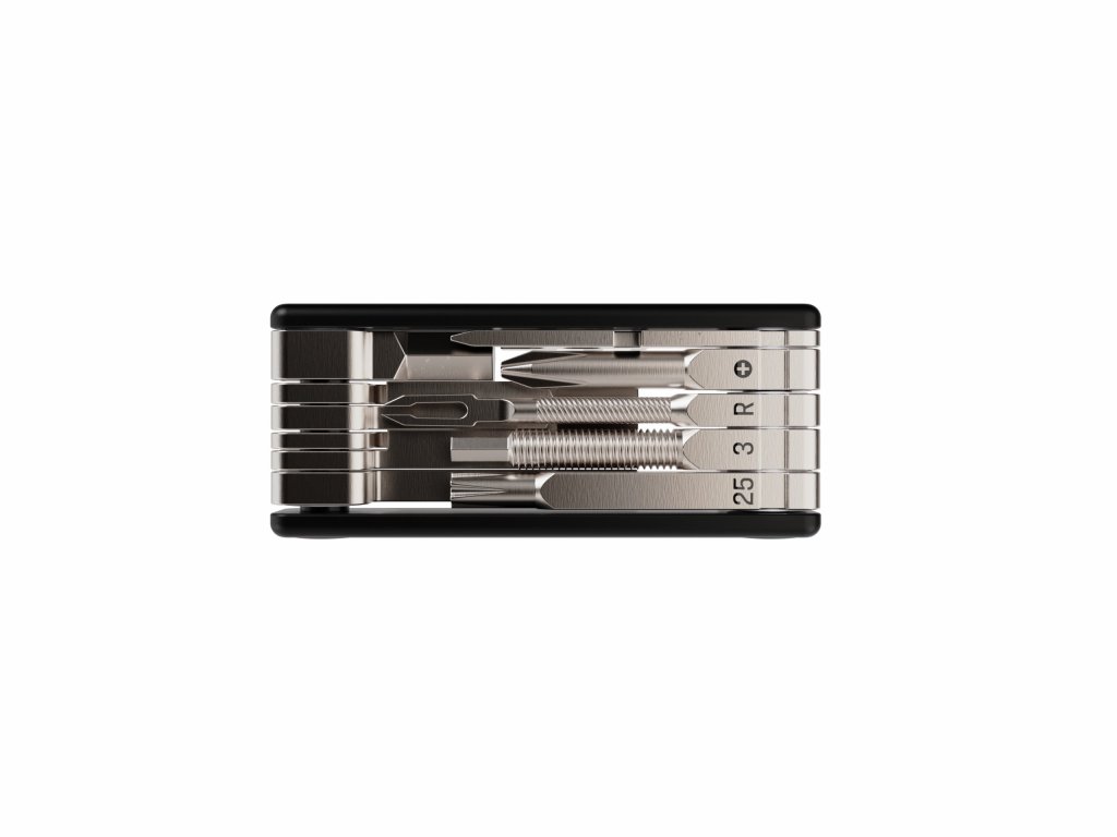 - Obsahuje imbusy 2, 2,5, 3, 4, 5, 6 a 8 mm, křížové a ploché šroubováky T25 a kleště na bezdušové pláště.